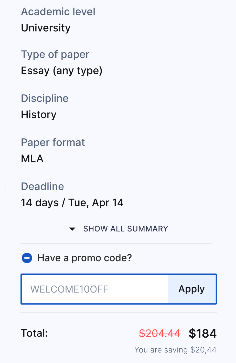 - The 10% Welcome Discount: We used the WELCOME10OFF code (a classic move), which brought our 14-day, 10-page University paper down to a very reasonable $184.