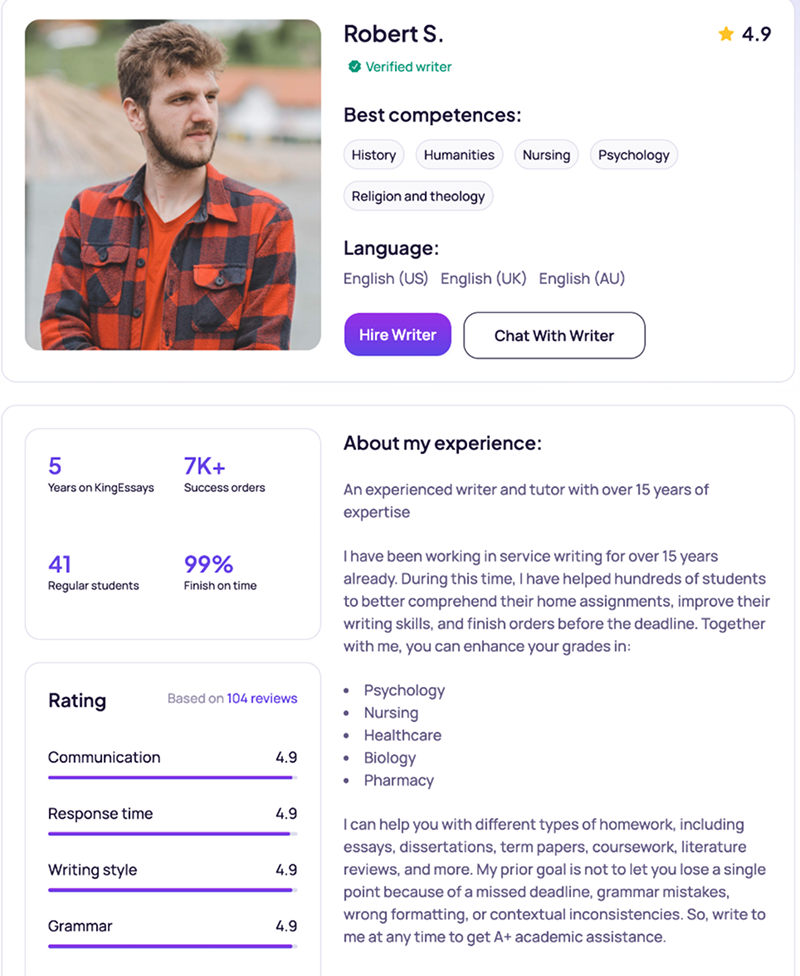 We specifically targeted their Top-Rated Writers. For our first order, we were assigned Robert S., a veteran in Humanities. For the second, high-pressure order, we drew Mariam R., a specialist in Arts and History. We wanted to see if these two experts would collaborate in the background or if KingEssays' system truly keeps each order as a "fresh start."