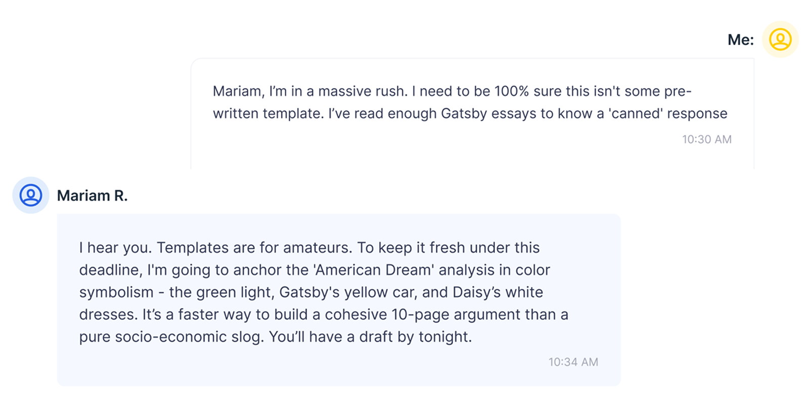 Client: "Mariam, I’m in a massive rush. I need to be 100% sure this isn't some pre-written template. I’ve read enough Gatsby essays to know a 'canned' response."