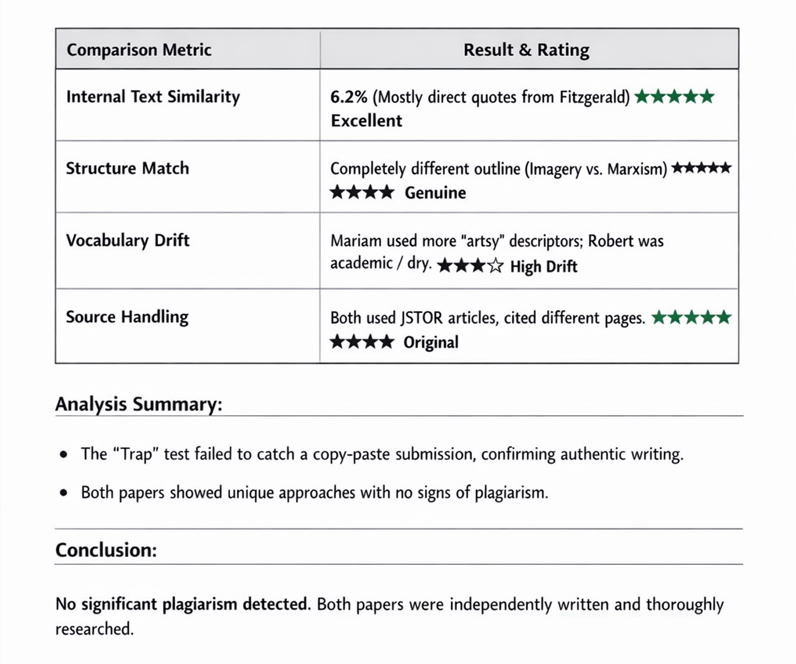 4. Forensic Comparison | Using professional Diff-checkers and AI-detectors to compare the two "Gatsby" papers side-by-side. |